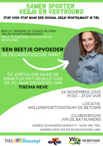 Op woensdag 26 november organiseert Tiel Beweegt in samenwerking met JVR de Batauwers en expert op het gebied van een pedagogisch sportklimaat, Tischa Neve, een scholingsavond over het creëren van een sociaal veilig sportklimaat op de sportverenigingen in Tiel. Deze avond zal plaatsvinden in het clubgebouw van JVR de Batauwers in het Wielersportcentrum de Betuwe. Adres: SCHAARSDIJKWEG 9 – 4006 MC TIEL.